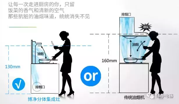 而博凈分體式集成灶采用低位側(cè)吸下排的吸油煙方式,油煙產(chǎn)生時(shí)即被吸走,黃金區(qū)域攏煙、排煙。